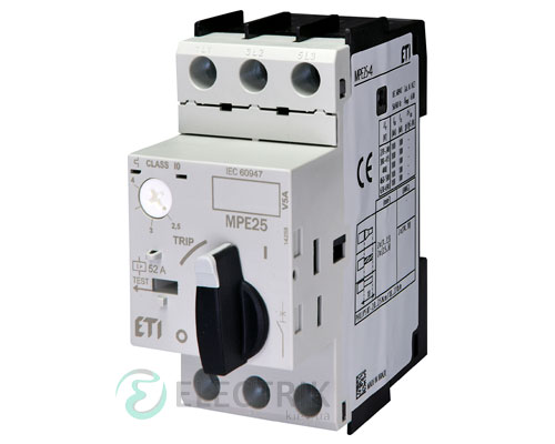 Автоматический выключатель защиты двигателя MPE25-4,0 разработан во избежание коротких замыканий, перегрузок и других отклонений в момент работы моторов (электродвигателей). На практике, такое устройство эксплуатируется в качестве основного либо дополнительного рубильника. Если добавить комплект контакторов, то вполне может получиться система дистанционного управления. Вместе с такими автоматами можно устанавливать множество различных аксессуаров. Также присутствует опция тестирования тепловой защиты, т.е. при нажатии кнопки «тест» происходит выключение двигателей. В таком случае прибор работает успешно и без каких-либо серьезных отклонений