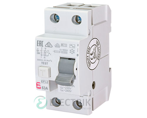 Дифференциальное реле (УЗО) EFI-2 63А 100мА тип AC 10кА, ETI предназначено для защиты человека от поражения электрическим током. В случаи прямого или не прямого контакта с токоведущими частями оборудования, которые могут быть под напряжениям, устройство срабатывает и отсекает напряжение.