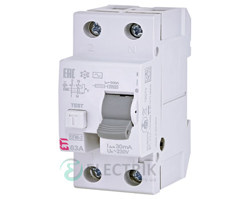 Дифференциальное реле (УЗО) EFI6-2 63А 30мА тип AC 6кА, ETI предназначено для защиты человека от поражения электрическим током. В случаи прямого или не прямого контакта с токоведущими частями оборудования, которые могут быть под напряжениям, устройство срабатывает и отсекает напряжение.