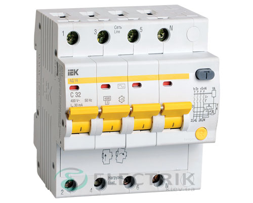 Назначение дифференциального автоматического выключателя АД14 4Р 32А 30мА IEK